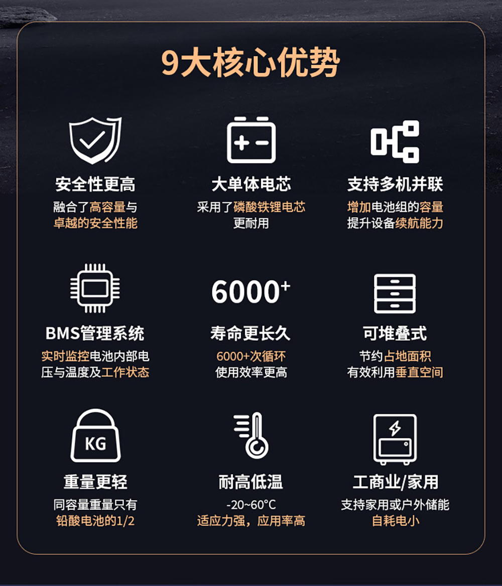 使用安全环保的磷酸铁锂电池,符合MSDS、UN38.3、ROHS、IEC62619和UL标准。
