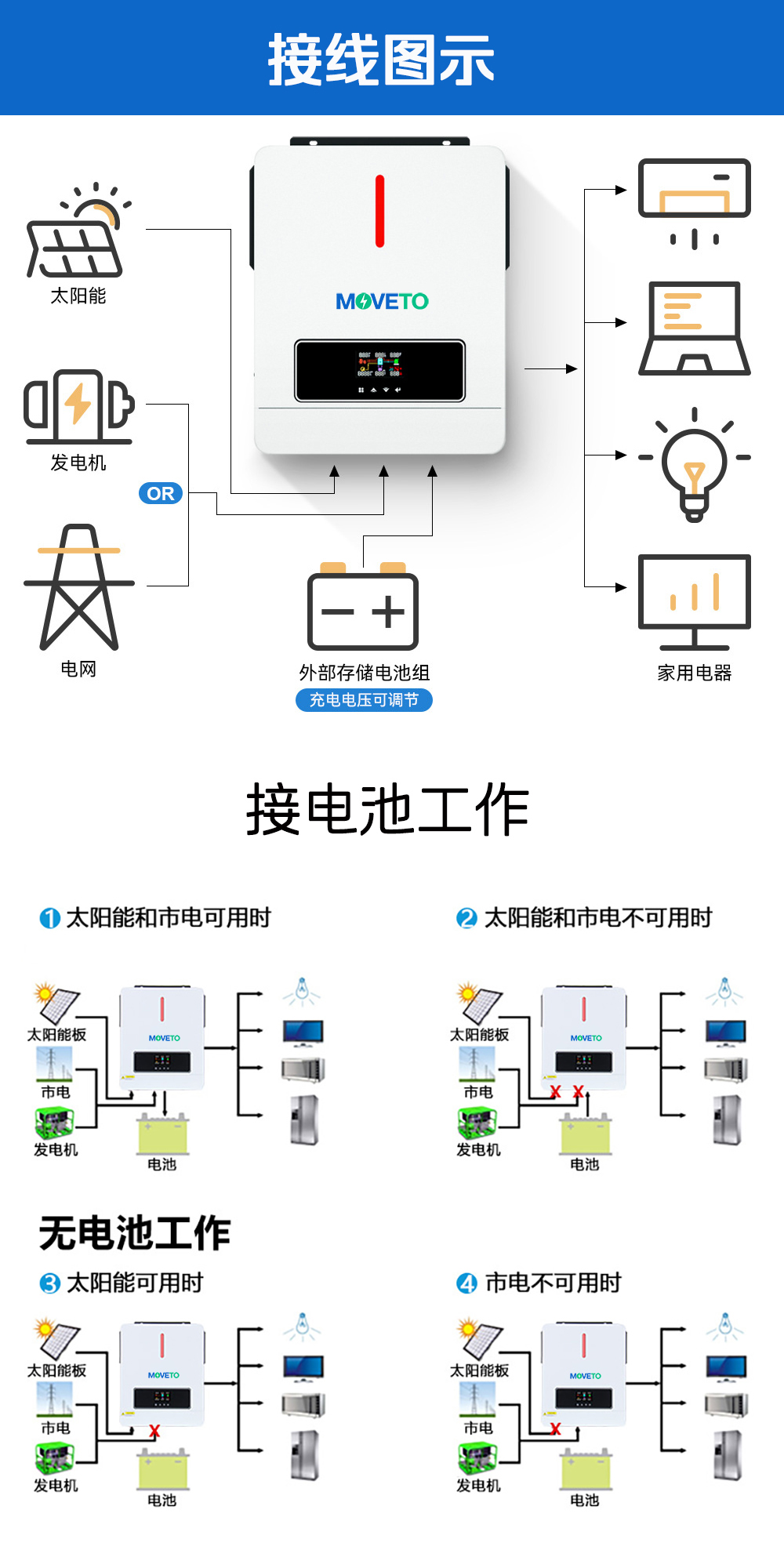 MoveTo.Solar 光伏电站能满足家用停电、应急备灾、移动办公、生意摆摊、房车露营、野外垂钓、户外作业、行业独立供电等场景的用电需求。